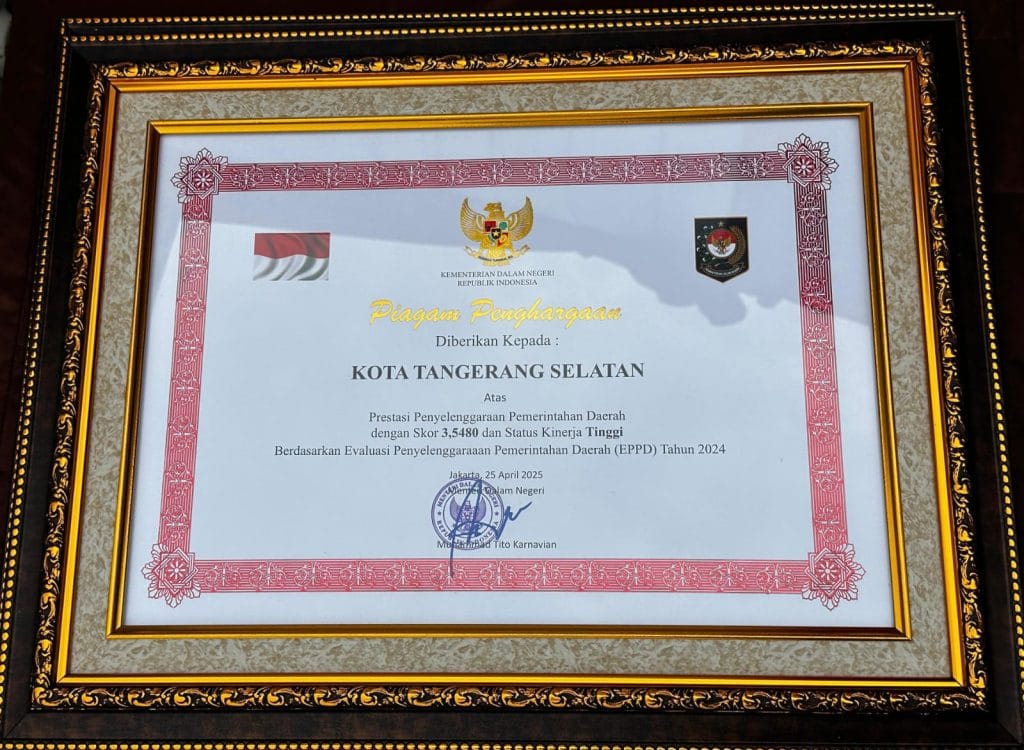 Sebagai bentuk apresiasi atas capaian kinerja tersebut, Kota Tangerang Selatan berhak menerima dua bentuk benefit, yakni Penghargaan Satyalancana Karya Bhakti Praja Nugraha dari Presiden RI kepada kepala daerah atas usulan Menteri Dalam negeri, dan rekomendasi pemberian intensif daerah oleh kementerian yang menangani bidang keuangan, sesuai ketentuan perundang-undangan.