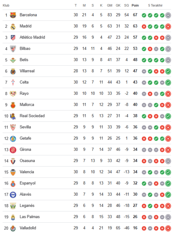 Meski demikian, dengan tambahan satu poin, Barcelona kini unggul empat angka atas Madrid. Blaugrana memuncaki klasemen Liga Spanyol dengan 67 poin.