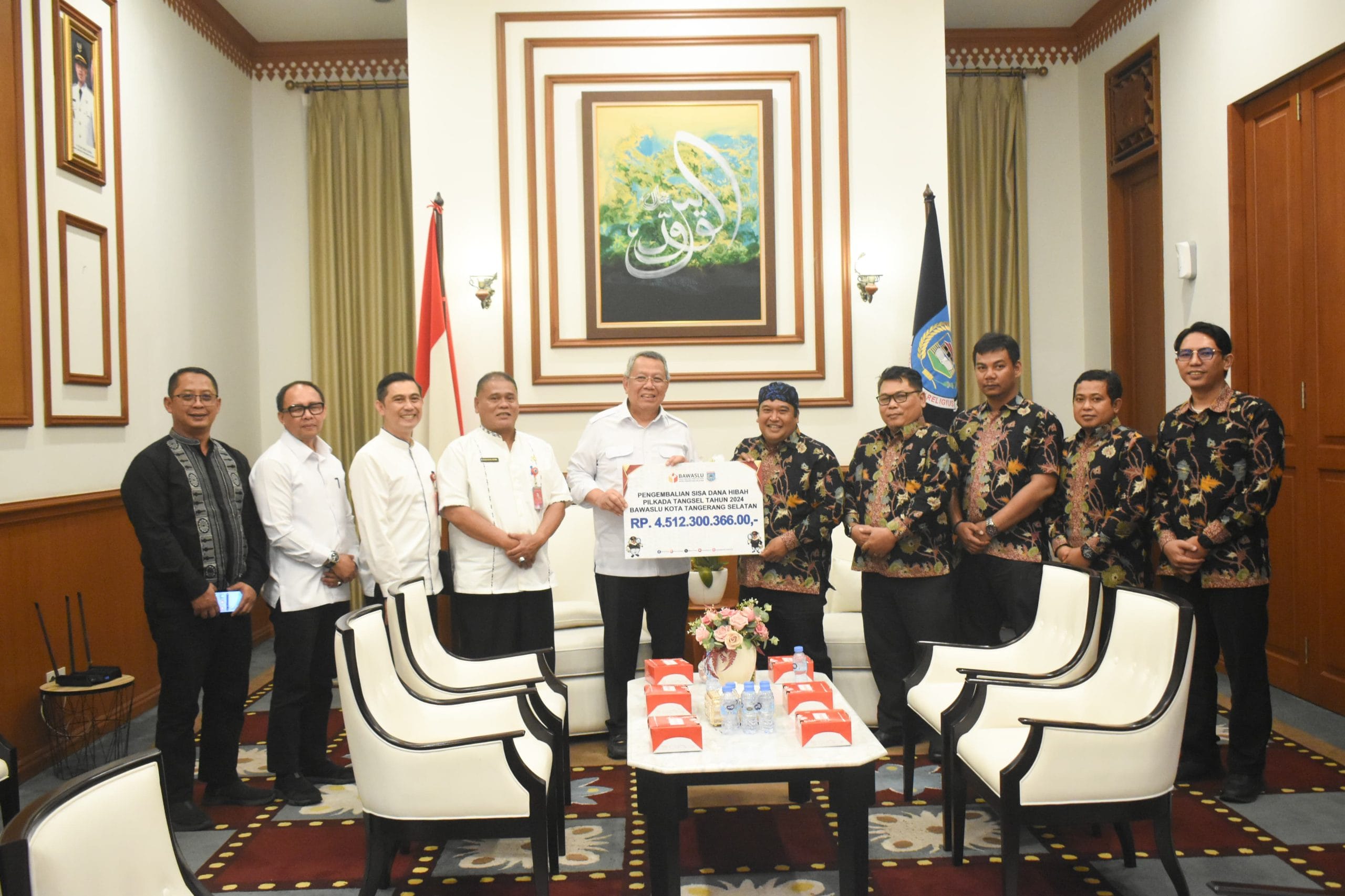 Pengembalian dana hibah diserahkan secara seremonial oleh seluruh jajaran Bawaslu dan diterima oleh Wali Kota Tangsel, Benyamin Davnie beserta jajaran di rumah dinasnya, Serpong, Jumat (16/05/2025).