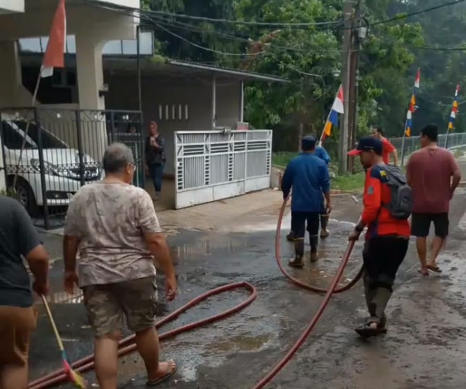 Usai surut, Pemkot Tangsel menerjunkan Dinas Pemadam Kebakaran dan Penyelamatan (Damkar) untuk melakukan penyemprotan lumpur di wilayah Villa Pamulang.