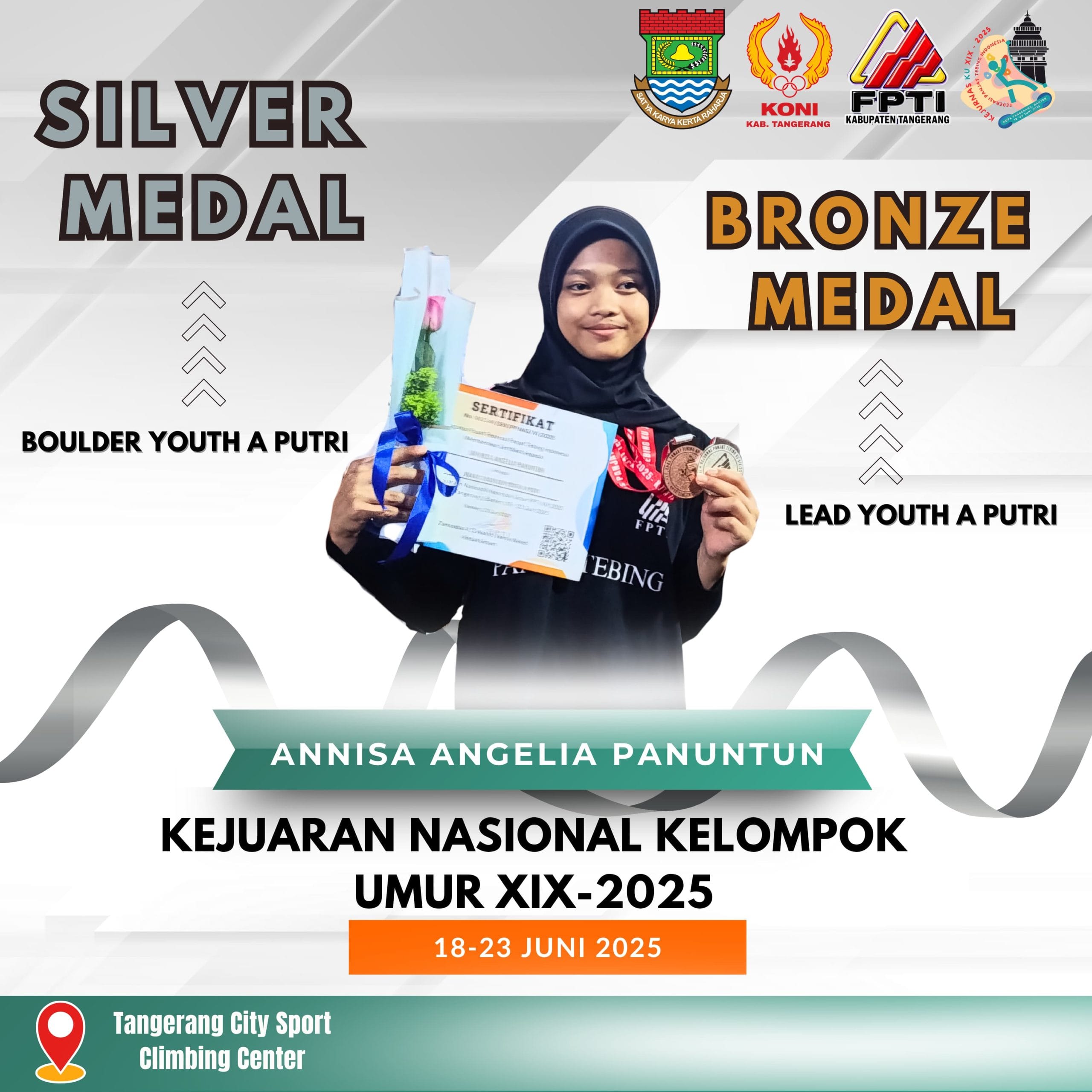 TANGERANG – Harapan besar akan lahirnya atlit profesional dalam kancah panjat tebing nasional dan internasional asal Banten, kini menyelimuti Federasi Panjat Tebing Indonesia (FPTI) Kabupaten Tangerang, kebahagiaan terjadi berkat keberhasilan atlit yunior atas nama Annisa Angelia Panuntun biasa di sapa Icha, berhasil menyabet medali perak dan perunggu dari dua kelas berbeda.