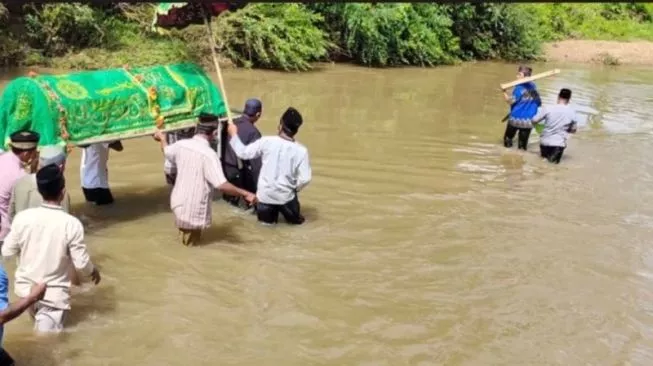 LAMPUNG – Beredar video sejumlah warga di Pekon (Desa) Pemerihan, Kecamatan Bangkunat, Kabupaten Pesisir Barat, Lampung menggotong jenazah menyeberangi sungai.