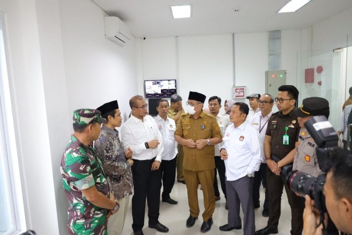 SETU – Wali Kota Tangerang Selatan Benyamin Davnie bersama ketua Komisi Pemilihan Umum (KPU) Republik Indonesia Hasyim Asy’ari yang didampingi ketua KPU Kota Tangsel, M. Taufik MZ meresmikan Gudang Logistik KPU, yang terletak berdampingan dengan Kantor KPU Tangsel, Setu, pada Senin (20/03).